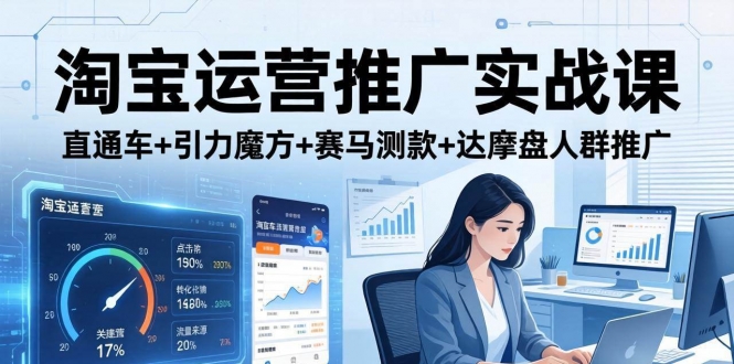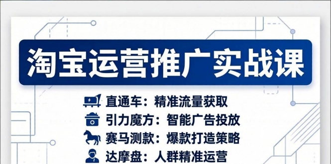 主要内容:直通车、引力魔方、赛马测款、达摩盘人群推广等多个核心内容。通过详细的案例分析和实操演示,帮助学员掌握店铺诊断、爆款拉升、动销计划、人群精准投放等关键技能。课
