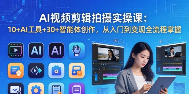 本课程是一套系统化的AI视频剪辑拍摄实操课,涵盖AI工具应用、智能体创作、剪映剪辑、拍摄技巧、抖音运营等全链路技能。课程分为AI工具详解(DeepSeek、即梦、可灵、Kimi、文心