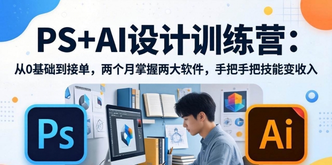 本课程是PS+AI设计训练营,从0基础到能接单,手把手教你将设计技能变成收入。课程涵盖PS基础操作(修图、美颜、商业精修、海报制作、调色、UI设计、双重曝光、滤镜、插件、三大